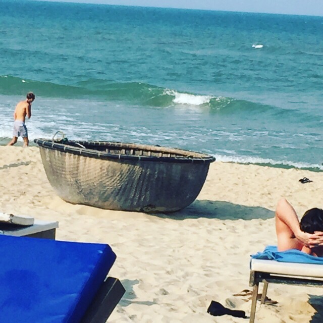 Für 150.000 Dong sind zwei Liegen, zwei Bier und ein Sonnenschirm die unsrigen. Am Strand sind dann auch anscheinend seetüchtige Gefährte, die verdeutlichen, warum es ‚Nussschale‘ heißt.