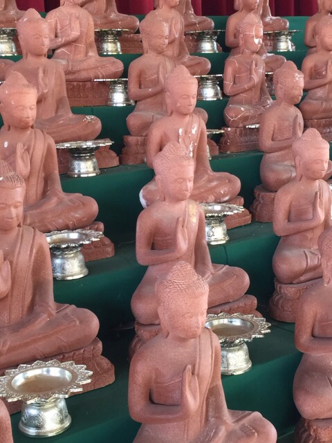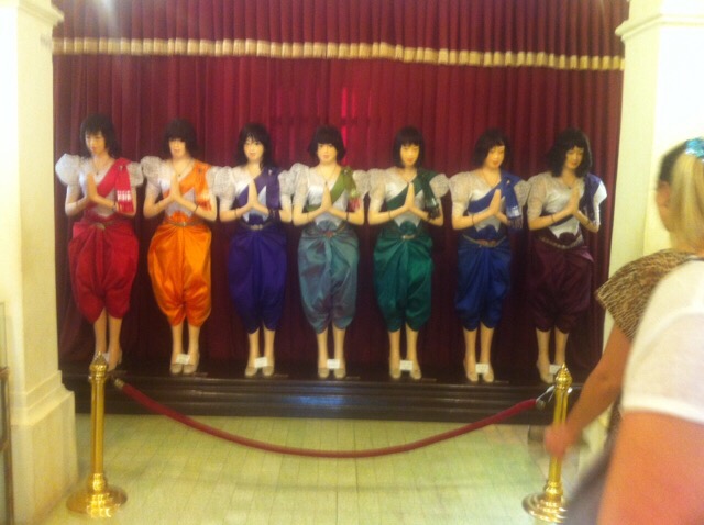 Im Palast ist noch die ein oder andere Pagode integriert (auch der König muss mal beten) und da heißt es wieder Schuhe aus (Titelbild … vermutlich war auch jemand aus des Königsfamilie im Tempel, anders kann ich mir die Hasen-Hausschuhe nich erklären … 38 Grad!). Ansonsten gibt es jeden Tag ein Kleid in einer anderen Farbe.