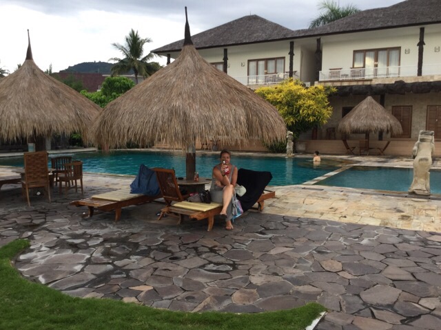 Wir wohnen in den Pasific Beach Bungalows, die wirklich schon bessere Tage gesehen haben, alles ein wenig „siffig“. Für eine Nacht wird es gehn. Der Regen hört auf und wir legen uns an den Pool mit Beach- und Sundown-View. Leider ist es zu wolkig und ab und an kommen noch ein paar Tropfen herunter. Egal! Ist nur ein Zwischenstopp auf dem Weg auf die Gilis.