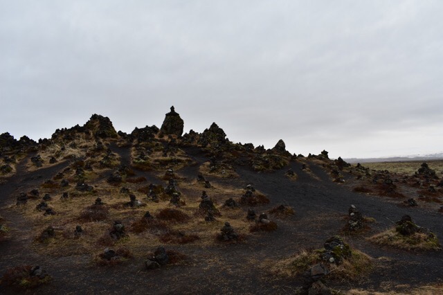 Am Rand unendlich viele kleine und große Steinhaufen. Ursprünglich haben die großen ehemalige Bauernhöfe markiert, die von Lawinen abgeräumt wurden. Irgendwann hat sich der Brauch etabliert, dass Reisende auch einen Steinhaufen zusammenbauen um für eine glückliche Reise zu bitten. Die isländische Regierung sponsort die Steine 🙂